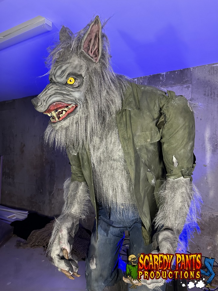 Design Overview: The animatronic werewolf stands approximately 7 feet tall, with a menacing stance that captures the essence of a classic horror creature. Its body is crafted from a combination of steel and durable latex rubber filled with foam, giving it both a robust frame and flexibility for movement. The surface is coated in faux fur, intricately detailed with varying shades of gray and black, mimicking the look of a real werewolf.