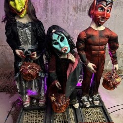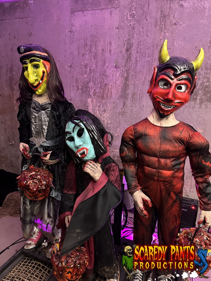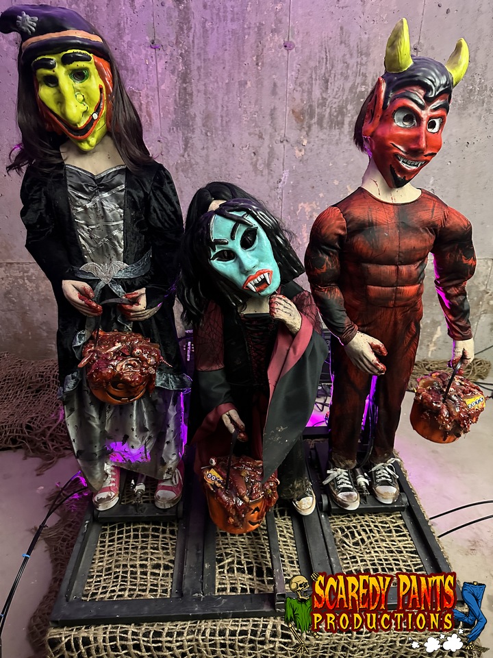 Design Overview: Step into a spine-chilling Halloween experience that blends the iconic styles of the 1980s with a grotesque twist. The Trick or Tr-eaters is a unique animatronic display that brings five retro, 1980s-inspired trick or treating children to life with terrifying realism. Each child is dressed in period-accurate, spooky costumes and is detailed with blood, giving them a chilling, bloody look. Powered by air pistons, their eerie motions, combined with their grotesque features, create a haunting and unforgettable centerpiece for your Halloween setup.