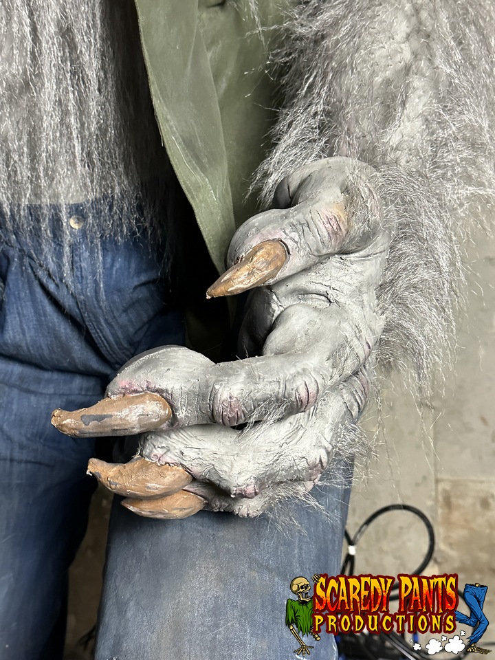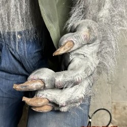 Design Overview: The animatronic werewolf stands approximately 7 feet tall, with a menacing stance that captures the essence of a classic horror creature. Its body is crafted from a combination of steel and durable latex rubber filled with foam, giving it both a robust frame and flexibility for movement. The surface is coated in faux fur, intricately detailed with varying shades of gray and black, mimicking the look of a real werewolf.